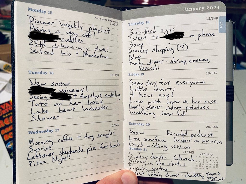 As a simple way to name the latter, I decided that I’d keep a joy logbook. I ordered a pocket weekly calendar, and since January 1st I’ve been writing down every instance that brings me joy throughout the day.